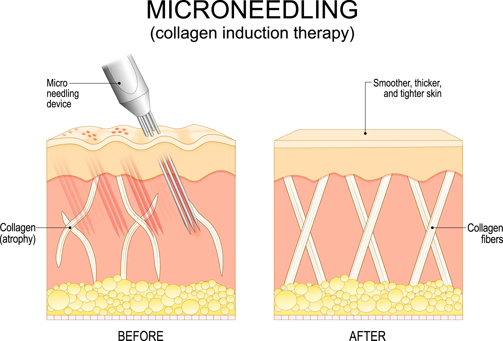 Microneedling, also known as collagen induction therapy, is a minimally invasive cosmetic procedure that uses fine, sterile needles to create micro-injuries in the skin’s surface. These tiny punctures trigger the body’s natural healing process, stimulating the production of collagen and elastin—key proteins that maintain skin firmness, elasticity, and overall appearance. The controlled skin injury also enhances cellular turnover and helps reduce the appearance of scars, fine lines, and enlarged pores over time.